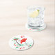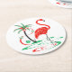 En roligt-, fetiv-, flamingodesign med en återtryck i rött och grönt. En röd flamingovågor i vatten intill handflatan träd, dekorerad med julbalkar och band. Ett anpassade som du kan anpassa med egen text, bilder och egna idéer. En originalbild för digital konst skapat av Jess Perry.