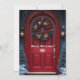 Julhälsningskort med söt röd, elegant dörr som dekoreras med en andedräkt med röda äpplen och guld-prydnadsföremål. Det finns prydnadsämnen i guld på båda sidor av dörren. Dörren har en gräs träd på vardera sidan.
