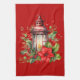 Kökshandduk med en mysigt julbild med en röd lanter omgiven av gräs och en poinsettia och holly