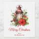 Flaska-etiketter med en mysigt julbild med en röd lanter omgiven av gräs och en poinsettia och holly.