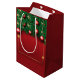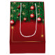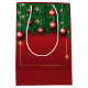 En festiv röd presentväska med grönt gräs grenar och glansa röda prydnadsföremål. väskan har en glansig avsluta som förbättrar dess pulserande färg. Handtagen är vita och ger en slående kontrast mot rikens röda bakgrund.