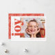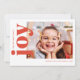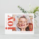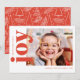 Detta är ett ljust och enkelt modernt rött och vitt julkort med ett minimalistiskt foto i kombination med “glädje” i en fet och klassisk serifstil.
