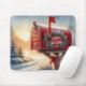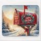 En festlig röd brevlåda försedd med ett "Glad helg" krandstånd i ett snöslandskap, som lyfts upp av sol varma glöd