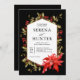 En elegant klassisk vinterbröllopsinbjudan som är perfekt för bröllop under julhelgen, denna design har en sexkantig geometrisk ram infattad i guld och omgiven av järnek och röda bär med en vacker röd julstjärna i det nedre hörnet. En modern textlayout med en kombination av elegant seriftext i par med handskriven kalligrafisk accenttext ger designen extra attraktionskraft. Denna inbjudan har en svart bakgrund för att på ett vackert sätt kontrastera mot barrträden och julstjärnan.