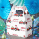 En söt illustration av en röd jultraktor lastbil med en julhatt och dekorerad i julklapp ljus som drar en vagn fylld med julklappar. Perfekt för pojkar och flickor som kärlek-traktorer, lastbilar, tunga maskiner, jordbruk eller bara kärlek leker med leksak lastbilar. En idealisk julfavör för traktorentusiaster lastbil stor eller liten, flickor eller pojkar.