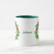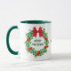 Det här söt helgdag mugg har en grönt andedräkt som är kopplad till en ljusröd båge. Omkring andedräkten är utspridda små röda fåglar. I mitten finns motsvarande grönt som säger "God jul", men du kan enkelt ändra den till vad du vill. Den andra sidan har samma bild med texten "Gott nytt år". Du kan använda en tredje text fält mellan två bilder för ditt namn. Se till att se matchande produkter i vår butik.