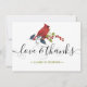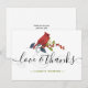 Skicka en personlig tacksedel till familj och vänner med det här elegantens anteckningskort för helgdag. Den här designmallen innehåller en röd kardinal som är inkörd på en gren med röda bär. Under det står Kärlek & Tack i ett modernt svart skript. Anpassa med ditt namn i grönt. Kortets baksida har ett tackmeddelande från personligen och namnteckning.