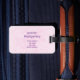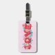 Ett resetagg med Kärlek skrivet i ett fet stil-block omgivet av hjärtan och vackra blommor. Skapat med vattenfärger. Ljus rosa mönstrad bakgrund.