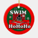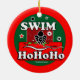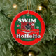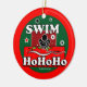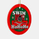 Bröstsimsimmaren i svarten, vit, rött och grönt på en ljus röd bakgrund hälsar helgdagar med SIMMA Ho Ho Ho! Konst på båda sidor av denna prydnad.