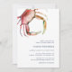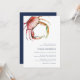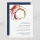 Kustnära bröllopsfest-inbjudan med vintage vattenfärg illustration av röd krabba, med din bröllopsfest information i klassisk marinblå. Perfekt för strand, sommar eller nautiskt tema bröllopsfester, dessa kustnära inbjudningar har baksidan i enfärgad marinblå.