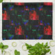 Röd kvadratisk mosaikövertäckning över mörk grönt kökshandduk