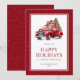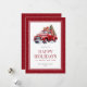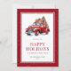 Akvarell Glad jul-kort med en retro röd lastbil som bär en julgran och presenter. Personalisera enkelt detta vinterliga julkort med ditt familjenamn och året.