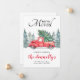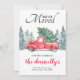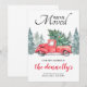 Rustik vintertema flyttkort med enkel vit bakgrund, akvarell granar, en vintage röd lastbil, ett julgran och en mall för ny adress som är enkel att anpassa.