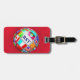 En röd bagagemärkre, med design av ett jordjordklot med flaggor av världen. Skriv din initialer för att personifiera den. Resa kassaskåpet!