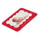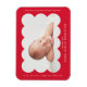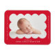Modern magnet för födelseannonsering med ditt barns foto placerat i en ljusröd ram med utskärningar. Anpassa den röda födelseannonseringsmagneten genom att lägga till ditt barns namn och ytterligare information i vit text.