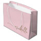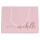 Modern Elegant Glam Rosa delikat Guld Monogram Namn Script Signatur Anpassad Personlig Presentpåse. Denna design har ett anpassat namn i en snygg, handskrivet svansfont med typografi i guld på ljus rosa eller babyrosa bakgrund. Dessa är lätta att anpassa. Denna feminina presentpåse är bra för husvärmningspresent, även för födelsedag, 16-års födelsedagsfest, bröllopsdusch, baby shower, mors dag, bröllop, för examenspresent och den är för tjejen som älskar unik elegans.