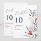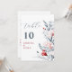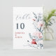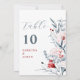 Kortet för bordsnummer i bröllop har elegant blommigt med rött och blåa blommor. Den visningar texten "Bord" i ett kursivt teckensnitt, följt av talet i stort, fetstilt teckensnitt. Den här designen är personlig för ett par som heter, vilket gör att inställningarna för bröllop bord blir mer sofistikerade. Visa matchande objekt i DreamHut-arkivet.