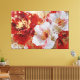 En livfull abstrakt väggkonst med stora blommor i rött, vitt och guld. Tjocka impastopinseldrag och palettknivstexturer skapar djup och rörelse, medan skimrande guldaccents ger en touch av lyx. Den djärva färgpaletten och den dynamiska kompositionen gör detta konstverk till en slående mittpunkt för moderna interiörer.