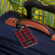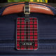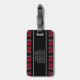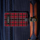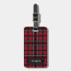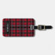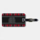 Röd och svart karotrutmönster med text bagagebricka