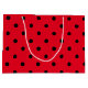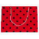 Gråväska med mönster av svart polka dots på röd bakgrund.