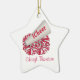 Stjärnformad Julgran-ornament, med en röd och vit cheerLeaders pom och en megafon som säger, iCheer, på den. Anpassa med ditt namn på grund.