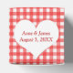 Vitt hjärta med nygifta namn på röd och vit gingham bakgrund.
