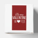 Perfekten paket för Valentin-dagspressen. Röd och vit randig Alla hjärtans dag-design med ett vitt "Bli min Valentine"-meddelande, ett vitt hjärta under budskapet tillsammans med datumet den 14 februari.