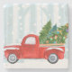 Rolig nostalgisk juldesign. Denna roliga festliga design presenterar en ljus röd gammal varubillastbil som fylls med julgranar i baksidaen mot en snöig skogbakgrund.