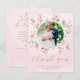 Tacka era bröllopsgäster med stil med detta eleganta, anpassade fototackkort med blommotiv. Denna designmall visar er bild på framsidan, infogad i en blomsterkrans av handmålade, skära rosor och grönska på en akvarellbakgrund. Under fotot står "Tack" med modern text och under det står era namn med bröllopsdatum för att anpassa det till er. Baksidan av kortet har ett personligt meddelande och signatur, kompletterat med en bukett rosor. Designad av Susan Coffley.