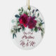 Här är ett vackert prydnadsämne som gör en underbar keepsaké för ett nytt par. Framsidan har en söt röd ros och en blommigt bukett högst upp, med ett rött skript som säger: "Vår första jul som Mr. Och Mrs." vid grund. Bilden och texten placeras på en vit bakgrund. Baksidan av prydnadsföremålet har ditt eget foto.
