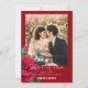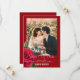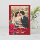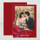 Röda bröllop spara datum-kort med fotomall. All text står längst ner, i vit skrivstil och tryckt teckensnitt. Förnamnen på paret sticker ut i fet, tryckt versal text. En realistisk, röd ros och rosenknopp pryder kanten. Lägg till ett vertikalt (porträtt) foto för bästa resultat. Välj även alternativet för omedelbar nedladdning för att dela bröllopsannonser online.