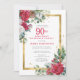 Vackrött och vitt ro är inkapslat i holly och eukalyptus löv för att skapa en visning för elegantens blommigt. De dekorerar ett stort guld ram och är klädda med konfektdamm från guld. 90:e födelsedag, party och personens namn är skrivna i en stor röd text. All text kan redigeras. Perfektens val för en speciell vinterfödelsedag.