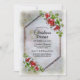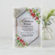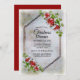 En elegant julmiddagsinbjudan med geometriska gräns och röda blommor.
