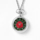 Ett foto av röd ros i en trädgård. Blommarna är helt öppen och exponerar gulten i mitten. Ett par röda knoppar växer bakom huvudblomman. Bakgrunden är fullt av grönt lövs. Det finns vita timmar och minuter klockan-ansikte för den här blomman bild. Bild Copyright ©Kimberly J Tilley.