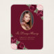 Vackrött minneskort för och rosa blommigt/begravningskort med ett foto med vattenfärg rosa och burgundisk röd ros och baby utandning på mörkens röda bakgrund.