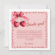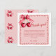 Säg tack på det sötaste sättet med våra Cherry On Top Bröllopsfest Kort! 🍒💌 Prydda med handritade röda och rosa körsbär bundna med ett ömt band och inramade av en vågig scalloperad kant, ger denna coquette-inspirerade design lekfull charm och hjärtlig elegans till din bröllopsfest-stationär. Det genomtänkta meddelandeområdet gör det enkelt att uttrycka din tacksamhet till nära och kära som gjorde din dag extra speciell. Perfekta för att matcha din körsbärstema-firande, är dessa tack-kort ett stilrent sätt att avsluta din bröllopsfest med kärlek och grace.