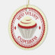 En prydnad som presenterar en illustration av en röd sammetmuffin med vitisläggninginsida ett dekorativ rött och vit, cirklar med röd text.