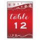 Röd, silver grått, vita snöflingor vinterplatskort för bordsnummer, med ett vågat band i silver grått med stjärnor och elegant snöflingor på ljusröd övertoningsbakgrund. Modern och contemporary som ändå passar för ett traditionellt bröllop. Denna elegant-, klass- och snyggt-utformning är ett val av perfekt för vinter, december eller bröllop till jul.