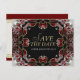 Elegant dekorativ design i djupröd och satin silver bröllop eller förlovnings kungörelse spara datum vykort. Prisvärda bröllopskort utan att kompromissa med stil och design.
