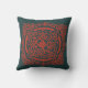 Dekorativ kudde med grafisk illustration av röd prydnad på mörkgrön bakgrund.