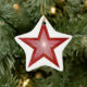 Modern design med en strålande, mousserande röd och vit stjärna på vit bakgrund. Stjärformad julgran-dekoration med röd och vit anpassade som du kan anpassa med din egen text, bilder och dina idéer. Skapat av Jess Perry med hjälp av originalfotografier och digitala tekniker.