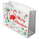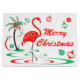 En rolig, festlig, flamingodesign med ett retro handlag i rött och grönt. En röd flamingo vadar i vatten bredvid en palmträd som dekoreras med det julbaubles och bandet. En anpassadedesign för att dig ska personifiera med dina egna text, bilder och idéer. En original- digital konst avbildar skapat av Jess Perry.