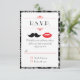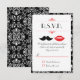 Läckra röda läppar och en elegant mustasch är huvudattraktionerna i denna moderna bröllopsinbjudan. Det damask-mönstrade bakgrunden tillför en touch av klass.