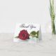 Säg tack med en ros! Detta charmiga blomsterkort har en röd burgunderros som ligger i regnet och framhäver en hälsning med texten "tack" i ett elegant skrivstil.