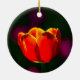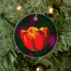 Skruva röd tulpanblomma mot mörk grönt bakgrund och rosa suddiga fläckar av andra tulpanblommor. Brand, solsken... Det nya livets symbol. Skin, belysa, bestråla och inspirera!