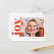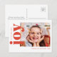Detta är ett ljust och enkelt rött och vitt vykort för högtider med en minimalistisk enkel foto kombinerat med “glädje” i en fet och elegant klassisk serif-typsnitt.