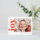 Detta är ett ljust och enkelt rött och vitt julkort med ett minimalistiskt foto i kombination med “glädje” i en fet och elegant klassisk serifstil.
