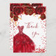 Ett feminin- och elegant födelsedagstack. En vit bakgrund med röd faux glitter, gnistor, röd ros och röd klänning. På framsidan finns ett skript med stora bokstäver och texten: Tack. Tillbaka: Anpassa och lägg till tackkort och namn. Namn är skrivet med ett modernt handskript i stil.