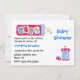 Kute till babydusch, med en vit baby flaska, överst, med grafisk text som läser BABY. En söt liten pojkes stripade overaller och par små röda tennisskor dekorerar inbjudningens grund-höger. Text är helt anpassade till kostym som du behöver.