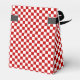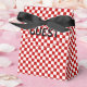 Markerad röd-vit-Tält-Stil-favoritruta - Markeringsrutan är täckt med bakgrunden mönster av små röda och vita fyrkanter. På klappen finns två textområden där du kan anpassa dig om du vill. Den översta texten är svart, undertill är samma text i vitt. Texten lyder: GUEST. Om du vill att båda textområdena ska ha samma sak, redigerar du dem. Ta bort texten om den inte är önskad. Mönster samordnar sig med Pizza Party och Chef Italiano i mina butiksgallerier. Det finns samordning av party.